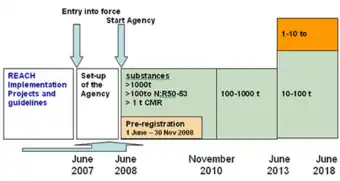 The European Chemicals Agency has set three major deadlines for registration of chemicals. In general these are determined by tonnage manufactured or imported, with 1000 tonnes/a. being required to be registered by 1 December 2010, 100 tonnes/a. by 1 June 2013 and 1 tonne/a. by 1 June 2018.[6] In addition, chemicals of higher concern or toxicity also have to meet the 2010 deadline.