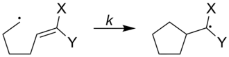 5-hexenyl radical undergoes cyclization to produce a five-membered ring because this is entropically and enthalpically more favored than the six-membered ring possibility.[1][3] The rate-constant for this reaction is 2.3×105 s−1 at 298 K.[5]