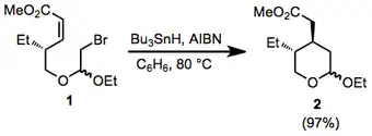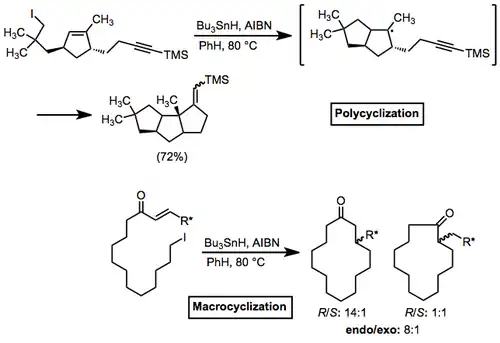 Polycycles and macrocycles can also be formed using radical cyclization reactions. In the former case, rings can be pre-formed and a single ring closed with radical cyclization, or multiple rings can be formed in a tandem process (as below).[17] Macrocyclizations, which lack the FMO requirement of cyclizations of smaller substrates, have the unique property of exhibiting endo selectivity.