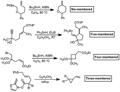 In general, radical cyclization to produce small rings is difficult. However, it is possible to trap the cyclized radical before re-opening. This process can be facilitated by fragmentation (see the three-membered case below) or by stabilization of the cyclized radical (see the four-membered case). Five- and six-membered rings are the most common sizes produced by radical cyclization.