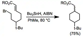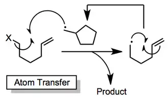 Atom-transfer methods rely on the movement of an atom from the acyclic starting material to the cyclic radical to generate the product.[13][14] These methods use catalytic amounts of weak reagents, preventing problems associated with the presence of strong reducing agents (such as tin hydride). Hydrogen- and halogen-transfer processes are known; the latter tend to be more synthetically useful.