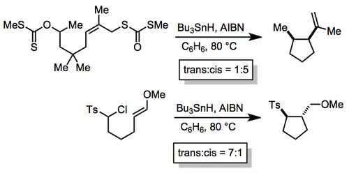 Substrates with stereocenters between the radical and multiple bond are often highly stereoselective. Radical cyclizations to form polycyclic products often take advantage of this property.[12]