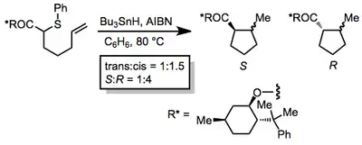 Chiral auxiliaries have been used in enantioselective radical cyclizations with limited success.[11] Small energy differences between early transition states constitute a profound barrier to success in this arena. In the example shown, diastereoselectivity (for both configurations of the left-hand stereocenter) is low and enantioselectivity is only moderate.