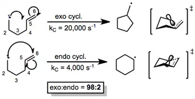 Because many reagents exist for radical generation and trapping, establishing a single prevailing mechanism is not possible. However, once a radical is generated, it can react with multiple bonds in an intramolecular fashion to yield cyclized radical intermediates. The two ends of the multiple bond constitute two possible sites of reaction. If the radical in the resulting intermediate ends up outside of the ring, the attack is termed "exo"; if it ends up inside the newly formed ring, the attack is called "endo." In many cases, exo cyclization is favored over endo cyclization (macrocyclizations constitute the major exception to this rule). 5-hexenyl radicals are the most synthetically useful intermediates for radical cyclizations, because cyclization is extremely rapid and exo selective.[3] Although the exo radical is less thermodynamically stable than the endo radical, the more rapid exo cyclization is rationalized by better orbital overlap in the chair-like exo transition state (see below).