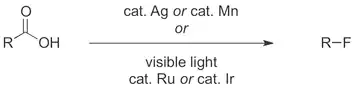 Carboxylic acids can be used as radical precursors in radical fluorination methods. Metal catalysts such as silver[17] and manganese[18] have been used to induce the fluorodecarboxylation. The fluorodecarboxylation of carboxylic acids can also be triggered using photoredox catalysis.[19][20] More specifically, phenoxyacetic acid derivatives have been shown to undergo fluorodecarboxylation when directly exposed to ultraviolet irradiation[21] or via the use of a photosensitizer.[22]