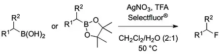 - ↑ Li, Zhaodong; Wang, Zhentao; Zhu, Lin; Tan, Xinqiang; Li, Chaozhong (Nov 2014). "Silver-Catalyzed Radical Fluorination of Alkylboronates in Aqueous Solution". Journal of the American Chemical Society. 136 (46): 16439–16443. doi:10.1021/ja509548z. PMID 25350556.