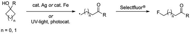 Cyclobutanols and cyclopropanols have been used as radical precursors for the synthesis of β- or γ-fluoroketones. The strained rings undergo C–C bond cleavage in presence of a silver[35][36] or an iron catalyst[36] or when exposed to ultraviolet light in presence of a photosensitizer.[37]