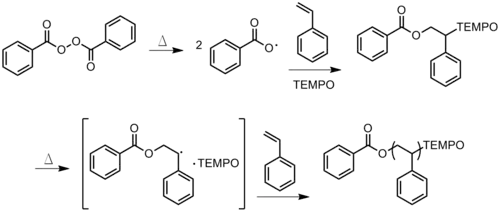 - Stable Free Radical Polymerization (SFRP): used to synthesize linear or branched polymers with narrow molecular weight distributions and reactive end groups on each polymer chain. The process has also been used to create block co-polymers with unique properties. Conversion rates are about 100% using this process but require temperatures of about 135 °C. This process is most commonly used with acrylates, styrenes, and dienes. The reaction scheme in Figure 23 illustrates the SFRP process.[19]