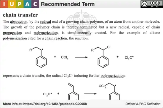 - 1 2 Colombani, Daniel (1997). "Chain-Growth Control in Free Radical Polymerization". Progress in Polymer Science. 22 (8): 1649–1720. doi:10.1016/S0079-6700(97)00022-1.