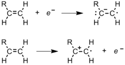 - Electrolysis of a solution containing both monomer and electrolyte. A monomer molecule will receive an electron at the cathode to become a radical anion, and a monomer molecule will give up an electron at the anode to form a radical cation (Figure 6). The radical ions then initiate free radical (and/or ionic) polymerization. This type of initiation is especially useful for coating metal surfaces with polymer films.[4]