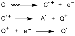 - α-, β-, γ-, or x-rays cause ejection of an electron from the initiating species, followed by dissociation and electron capture to produce a radical (Figure 5).[2]