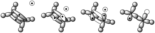 During polymerization, a polymer spends most of its time in increasing its chain length, or propagating. After the radical initiator is formed, it attacks a monomer (Figure 11).[8] In an ethene monomer, one electron pair is held securely between the two carbons in a sigma bond. The other is more loosely held in a pi bond. The free radical uses one electron from the pi bond to form a more stable bond with the carbon atom. The other electron returns to the second carbon atom, turning the whole molecule into another radical. This begins the polymer chain. Figure 12 shows how the orbitals of an ethylene monomer interact with a radical initiator.[9]