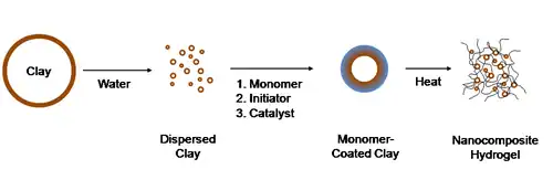 Radical polymerization also aids synthesis of nanocomposite hydrogels.[34] These gels are made of water-swellable nano-scale clay (especially those classed as smectites) enveloped by a network polymer. Aqueous dispersions of clay are treated with an initiator and a catalyst and the organic monomer, generally an acrylamide. Polymers grow off the initiators that are in turn bound to the clay. Due to recombination and disproportionation reactions, growing polymer chains bind to one another, forming a strong, cross-linked network polymer, with clay particles acting as branching points for multiple polymer chain segments.[35] Free radical polymerization used in this context allows the synthesis of polymers from a wide variety of substrates (the chemistries of suitable clays vary). Termination reactions unique to chain growth polymerization produce a material with flexibility, mechanical strength and biocompatibility.
