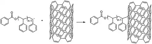Free radical polymerization allows the functionalization of carbon nanotubes.[32] CNTs intrinsic electronic properties lead them to form large aggregates in solution, precluding useful applications. Adding small chemical groups to the walls of CNT can eliminate this propensity and tune the response to the surrounding environment. The use of polymers instead of smaller molecules can modify CNT properties (and conversely, nanotubes can modify polymer mechanical and electronic properties).[29] For example, researchers coated carbon nanotubes with polystyrene by first polymerizing polystyrene via chain radical polymerization and subsequently mixing it at 130 °C with carbon nanotubes to generate radicals and graft them onto the walls of carbon nanotubes (Figure 27).[33] Chain growth polymerization ("grafting to") synthesizes a polymer with predetermined properties. Purification of the polymer can be used to obtain a more uniform length distribution before grafting. Conversely, “grafting from”, with radical polymerization techniques such as atom transfer radical polymerization (ATRP) or nitroxide-mediated polymerization (NMP), allows rapid growth of high molecular weight polymers.