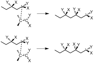 When a monomer adds to a radical chain end, there are two factors to consider regarding its stereochemistry: 1) the interaction between the terminal chain carbon and the approaching monomer molecule and 2) the configuration of the penultimate repeating unit in the polymer chain.[4] The terminal carbon atom has sp2 hybridization and is planar. Consider the polymerization of the monomer CH2=CXY. There are two ways that a monomer molecule can approach the terminal carbon: the mirror approach (with like substituents on the same side) or the non-mirror approach (like substituents on opposite sides). If free rotation does not occur before the next monomer adds, the mirror approach will always lead to an isotactic polymer and the non-mirror approach will always lead to a syndiotactic polymer (Figure 25).[4]