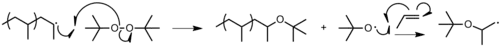 Figure 21: Chain transfer from polypropylene to di-t-butyl peroxide initiator. - To polymer: the radical of a polymer chain abstracts a hydrogen atom from somewhere on another polymer chain (Figure 22). This terminates the growth of one polymer chain, but allows the other to branch and resume growing. This reaction step changes neither the number of polymer chains nor the number of monomers which have been polymerized, so that the number-average degree of polymerization is unaffected.[12]