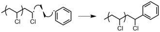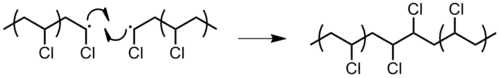 Figure 14: Termination by the combination of two poly(vinyl chloride) (PVC) polymers. - Radical disproportionation: a hydrogen atom from one chain end is abstracted to another, producing a polymer with a terminal unsaturated group and a polymer with a terminal saturated group (Figure 15).[4]