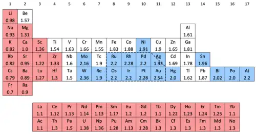 The image shows a periodic table extract with the electronegativity values of metals.[12]