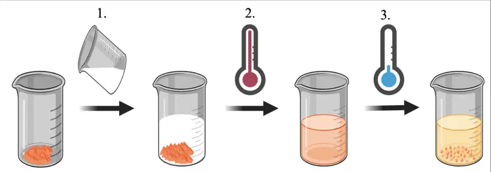 The simplest example of recrystallization is by temperature manipulation of a solution where the isolate compound has an endothermic dissolution (ΔH > 0) and a solubility product Ksp that increases with temperature. A saturated solution of the impure sample (usually in a disordered state of matter, such as a solid powder or a viscous liquid) is prepared near or at the boiling point of the solvent, and then the solution is slowly cooled to form a supersaturated solution where crystal nucleation (and thus formation) is imminent. [3]