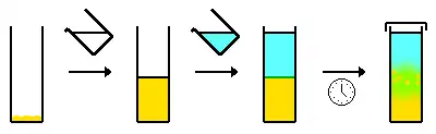 - Interface/slow mixing (often performed in an NMR tube). Similar to the above, but instead of one solvent gas-diffusing into another, the two solvents mix (diffuse) by liquid-liquid diffusion. Typically a second solvent is "layered" carefully on top of the solution containing the compound. Over time the two solution mix. As the solvent composition changes due to diffusion, the compound becomes increasingly insoluble in solution and crystallizes, usually at the interface. Additionally, it is better to use a denser solvent as the lower layer, and/or a hotter solvent as the upper layer because this results in the slower mixing of the solvents.
