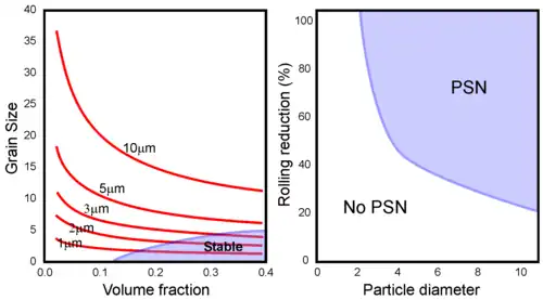The size and misorientation of the deformed zone is related to the particle size and so there is a minimum particle size required to initiate nucleation. Increasing the extent of deformation will reduce the minimum particle size, leading to a PSN regime in size-deformation space. If the efficiency of PSN is one (i.e. each particle stimulates one nuclei), then the final grain size will be simply determined by the number of particles. Occasionally the efficiency can be greater than one if multiple nuclei form at each particle but this is uncommon. The efficiency will be less than one if the particles are close to the critical size and large fractions of small particles will actually prevent recrystallization rather than initiating it (see above).