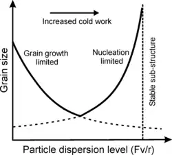 Recrystallization is prevented or significantly slowed by a dispersion of small, closely spaced particles due to Zener pinning on both low- and high-angle grain boundaries. This pressure directly opposes the driving force arising from the dislocation density and will influence both the nucleation and growth kinetics. The effect can be rationalized with respect to the particle dispersion level where is the volume fraction of the second phase and r is the radius. At low the grain size is determined by the number of nuclei, and so initially may be very small. However the grains are unstable with respect to grain growth and so will grow during annealing until the particles exert sufficient pinning pressure to halt them. At moderate the grain size is still determined by the number of nuclei but now the grains are stable with respect to normal growth (while abnormal growth is still possible). At high the unrecrystallized deformed structure is stable and recrystallization is suppressed.