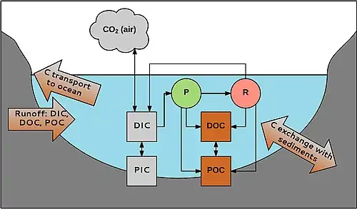 POC can be degraded to form DOC; DOC can become POC by flocculation. Inorganic and organic carbon are linked through aquatic organisms. CO2 is used in photosynthesis (P) by for instance macrophytes, produced by respiration (R), and exchanged with the atmosphere. Organic carbon is produced by organisms and is released during and after their life; e.g., in rivers, 1–20% of the total amount of DOC is produced by macrophytes.[38] Carbon can enter the system from the catchment and is transported to the oceans by rivers and streams. There is also exchange with carbon in the sediments, e.g., burial of organic carbon, which is important for carbon sequestration in aquatic habitats.[50]