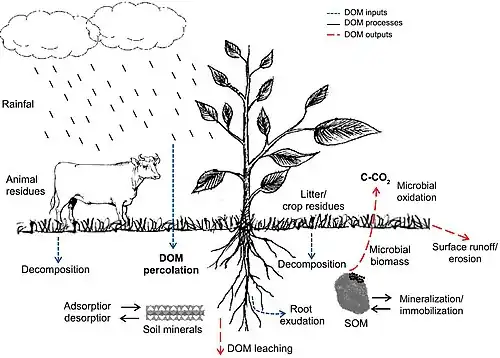 Dissolved organic matter (DOM) is one of the most active and mobile carbon pools and has an important role in global carbon cycling.[41] In addition, dissolved organic carbon (DOC) affects the soil negative electrical charges denitrification process, acid-base reactions in the soil solution, retention and translocation of nutrients (cations), and immobilization of heavy metals and xenobiotics.[42] Soil DOM can be derived from different sources (inputs), such as atmospheric carbon dissolved in rainfall, litter and crop residues, manure, root exudates, and decomposition of soil organic matter (SOM). In the soil, DOM availability depends on its interactions with mineral components (e.g., clays, Fe and Al oxides) modulated by adsorption and desorption processes.[43] It also depends on SOM fractions (e.g., stabilized organic molecules and microbial biomass) by mineralization and immobilization processes. In addition, the intensity of these interactions changes according to soil inherent properties,[44] land use, and crop management.[43][35]