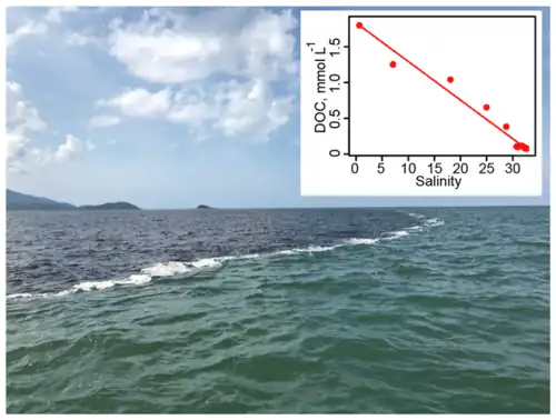 Thermal degradation of DOC has been found at high-temperature hydrothermal ridge-flanks, where outflow DOC concentrations are lower than in the inflow. While the global impact of these processes has not been investigated, current data suggest it is a minor DOC sink.[93] Abiotic DOC flocculation is often observed during rapid (minutes) shifts in salinity when fresh and marine waters mix.[101] Flocculation changes the DOC chemical composition, by removing humic compounds and reducing molecular size, transforming DOC to particulate organic flocs which can sediment and/or be consumed by grazers and filter feeders, but it also stimulates the bacterial degradation of the flocculated DOC.[102] The impacts of flocculation on the removal of DOC from coastal waters are highly variable with some studies suggesting it can remove up to 30% of the DOC pool,[103][104] while others find much lower values (3–6%;[105]). Such differences could be explained by seasonal and system differences in the DOC chemical composition, pH, metallic cation concentration, microbial reactivity, and ionic strength.[101][106][7]
