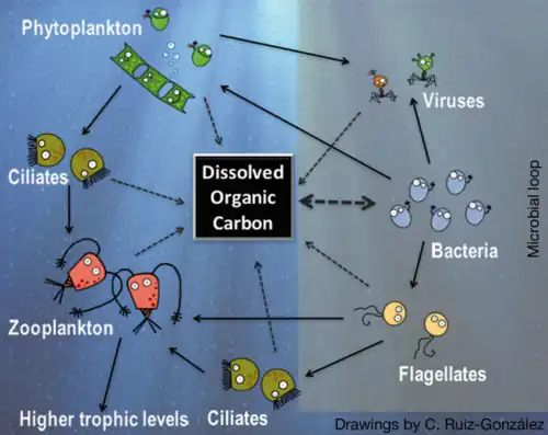 Right side: microbial loop, with bacteria using dissolved organic carbon to gain biomass, which then re-enters the classic carbon flow through protists.[76][77]