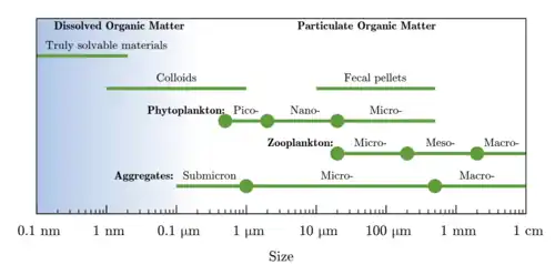 Dissolved organic carbon (DOC) is the fraction of organic carbon operationally defined as that which can pass through a filter with a pore size typically between 0.22 and 0.7 micrometers.[2] The fraction remaining on the filter is called particulate organic carbon (POC).[3]