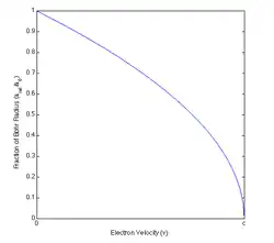 At right, the above ratio of the relativistic and nonrelativistic Bohr radii has been plotted as a function of the electron velocity. Notice how the relativistic model shows the radius decreases with increasing velocity.