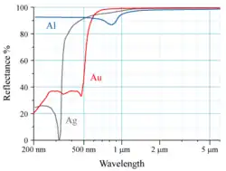 The reflectivity of aluminium (Al), silver (Ag), and gold (Au) is shown in the graph to the right. The human eye sees electromagnetic radiation with a wavelength near 600 nm as yellow. Gold absorbs blue light more than it absorbs other visible wavelengths of light; the reflected light reaching the eye is therefore lacking in blue compared with the incident light. Since yellow is complementary to blue, this makes a piece of gold under white light appear yellow to human eyes.