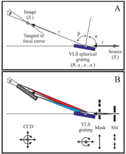 After the collecting optics X-rays are dispersed by the varied line spacing (VLS) grating that can be either plane or spherical. In the former case, a vertical focusing mirror is added to the optical path to focus the X-rays on the detector, in the latter the grating itself also focuses the dispersed X-rays on the CCD detector. Depending on the absorption edge chosen for the experiment, the respective positions between the grating and the detector, and the incidence angle of the grating can be tuned to optimize the spectrometer in a large energy window, without changing any optical element.[13][14][15][16]