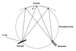 The optical layout for hard X-rays RIXS spectrometers is different. The spectrometers are based on spherical crystal analyzers (typically more than one to increase the solid angle of the spectrometer) exploiting Bragg reflections and on a position sensitive detector, typically in the so called Rowland geometry. This means that the source (X-rays spot on the sample), the analyzers and the detector must sit on the Rowland circle. By scanning the positions of the analyzers and of the detector (the source is fixed for convenience) the Bragg condition is changed and thus the energy of the scattered X-rays can be analyzed. By increasing the radius of the Rowland circle, the energy resolution can be increased, loosing in terms of efficiency. Nevertheless, as opposed to soft X-rays spectrometers, the resolving power of the spectrometer is limited by the crystal analyzers. Thus, increasing too much the dimensions of the spectrometer does not pay off.[18][22][23]