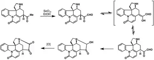 In their strychnine total synthesis, R.B. Woodward and co-workers leveraged the Riley Oxidation to attain the trans-glyoxal. Epimerization of the alpha hydrogen led to cis-glyoxal, which spontaneously underwent cyclization with the secondary amine to yield dehydrostryninone.[11]