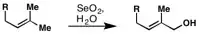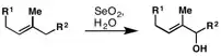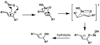 Allylic oxidation using selenium-dioxide proceeds via an ene reaction at the electrophilic selenium center. A 2,3-sigmatropic shift, proceeding through an envelope-like transition state, gives the allylselenite ester, which upon hydrolysis gives the allylic alcohol. The (E)- orientation about the double bond, a consequence of the envelope-like transition state, is observed in the penultimate ester formation, is retained during the hydrolysis step giving the (E)-allylic alcohol product.[4][10]
