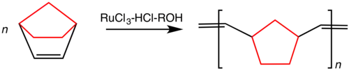 ROMP reaction giving polynorbornene. Like most commercial alkene metathesis processes, this reaction does not employ a well-defined molecular catalyst.