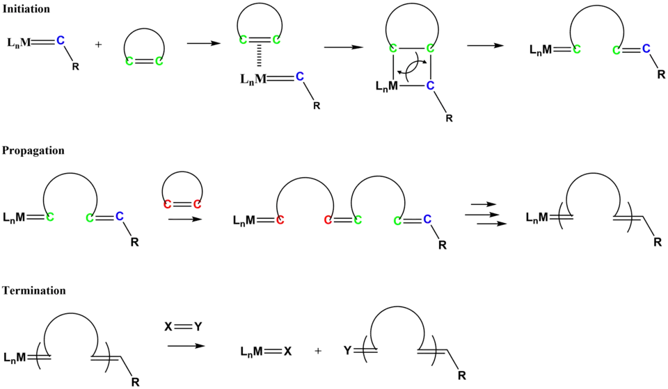The mechanism for ROMP follows similar pathways as olefin metathesis. The initiation process involves the coordination of the cycloalkene monomer to the metal alkylidene complex, followed by a [2+2] type cycloaddition to form the metallacyclobutane intermediate that cycloreverts to form a new alkylidene species.[24][25]
