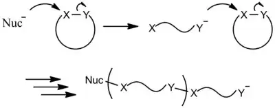 Anionic ring-opening polymerizations (AROP) involve nucleophilic reagents as initiators. Monomers with a three-member ring structure - such as epoxides, aziridines, and episulfides - undergo anionic ROP.[21]