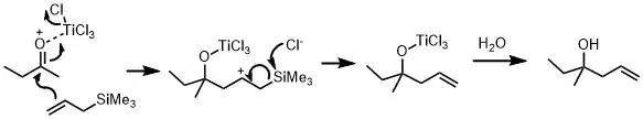 The Sakurai reaction (also known as the Hosomi–Sakurai reaction) is the chemical reaction of carbon electrophiles (such as a ketone shown here) with allyltrimethylsilane catalyzed by strong Lewis acids.[1][2][3] The reaction achieves results similar to the addition of an allyl Grignard reagent to the carbonyl.