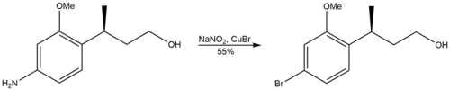 One of the most important uses of the Sandmeyer reaction is the formation of aryl halides. The solvent of choice for the synthesis of iodoarenes is diiodomethane,[17][18] while for the synthesis of bromoarenes, bromoform is used. For the synthesis of chloroarenes, chloroform is the solvent of choice.[19] The synthesis of (+)-curcuphenol, a bioactive compound that displays antifungal and anticancer activity, employs the Sandmeyer reaction to substitute an amine group by a bromo group.[20]