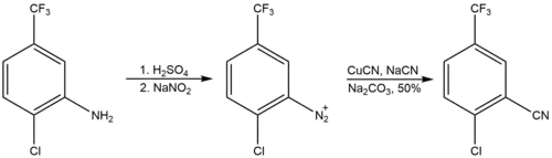Another use of the Sandmeyer reaction is for cyanation which allows for the formation of benzonitriles, an important class of organic compounds. A key intermediate in the synthesis of the antipsychotic drug Fluanxol is synthesized by a cyanation through the Sandmeyer reaction.[23]