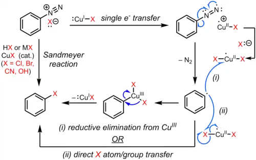 The Sandmeyer reaction is an example of a radical-nucleophilic aromatic substitution (SRNAr). The radical mechanism of the Sandmeyer reaction is supported by the detection of biaryl byproducts.[8] The substitution of the aromatic diazo group with a halogen or pseudohalogen is initiated by a one-electron transfer mechanism catalyzed by copper(I) to form an aryl radical with loss of nitrogen gas.[9][10][11][8] The substituted arene is possibly formed by direct transfer of Cl, Br, CN, or OH from a copper(II) species to the aryl radical to produce the substituted arene and regenerate the copper(I) catalyst. In an alternative proposal, a transient copper(III) intermediate, formed from coupling of the aryl radical with the copper(II) species, undergoes rapid reductive elimination to afford the product and regenerate copper(I).[12][13][14] However, evidence for such an organocopper intermediate is weak and mostly circumstantial,[15][16] and the exact pathway may depend on the substrate and reaction conditions.