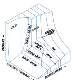 Within the dome itself, there is a liquid–vapor mixture. This two-phase region is commonly referred to as the “wet” region. The percentage of liquid and vapor can be calculated using vapor quality.[2] The triple state line is where the three phases (solid, liquid, and vapor) exist in equilibrium.