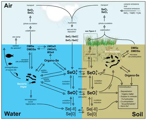 - ↑ Winkel, Lenny; Vriens, Bas; Jones, Gerrad; Schneider, Leila; Pilon-Smits, Elizabeth; Bañuelos, Gary (2015). "Selenium Cycling Across Soil-Plant-Atmosphere Interfaces: A Critical Review". Nutrients. 7 (6): 4199–4239. doi:10.3390/nu7064199. PMC 4488781. PMID 26035246.