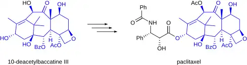 Practical applications of semisynthesis include the groundbreaking isolation of the antibiotic chlortetracycline and the subsequent semisynthesis of antibiotics such as tetracycline, doxycycline, and tigecycline.[4][5] Other notable examples include the early commercial production of the anti-cancer agent paclitaxel from 10-deacetylbaccatin, isolated from Taxus baccata (European yew),[1] the semisynthesis of LSD from ergotamine (derived from fungal cultures of ergot), and the preparation of the antimalarial drug artemether from the naturally occurring compound artemisinin.[2] As synthetic chemistry advances, transformations that were previously too costly or difficult to achieve become more feasible, influencing the economic viability of semisynthetic routes.[3]