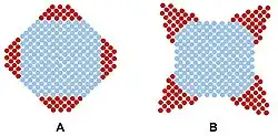 A commonly used production method of nanocrystals is that of growth by monomer addition. A seed is formed or placed in a solution of monomers that are the building blocks of the crystal. The nanocrystal (seed) grows larger by consuming the monomers in solution. The addition of a monomer to the crystal happens at the highest energy facet of the crystal, since that is the most active site and the monomer deposition thus has the lowest activation energy there.[6] Usually, this facet is situated at a corner of the nanoparticle. These facets however, as explained in the section above, are not the most energetically favorable position for the added monomer. Thus the monomer will, if it gets the chance to, diffuse along the crystal surface to a lower energy site.[9]