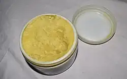 Shea butter (/ʃiː/ SHEE, /ˈʃiːə/ SHEE-ə, or /ʃeɪ/ SHAY; Bambara: ߛߌ߮ߕߎߟߎ, romanized: sìtulu[1]) is a fat (triglyceride; mainly oleic acid and stearic acid) extracted from the nut of the African shea tree (Vitellaria paradoxa).[2] It is ivory in color when raw and commonly dyed yellow with borututu root or palm oil. It is widely used in cosmetics as a moisturizer or lotion. It is edible and is used in food preparation in some African countries.[3] It is occasionally mixed with other oils as a substitute for cocoa butter, although the taste is noticeably different.[4][5]