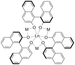 The Shibasaki group produced the first chiral lanthanide-binaphtholate complex in 1992, which was used to catalyse nitroaldol reactions.[1] The complex was not characterised but was the first to perform the reaction enantioselectively. This success led to further research which resulted in the development of heterometallic complexes with the formula [Ln(binol)3(M)3], the structure of which was elucidated by X-ray crystallography.[2]